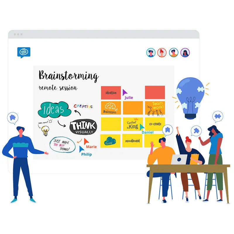 Team meetings use smart whiteboards to display mind maps in one space for interactive brainstorming and capturing ideas, design creativity and innovation, etc.