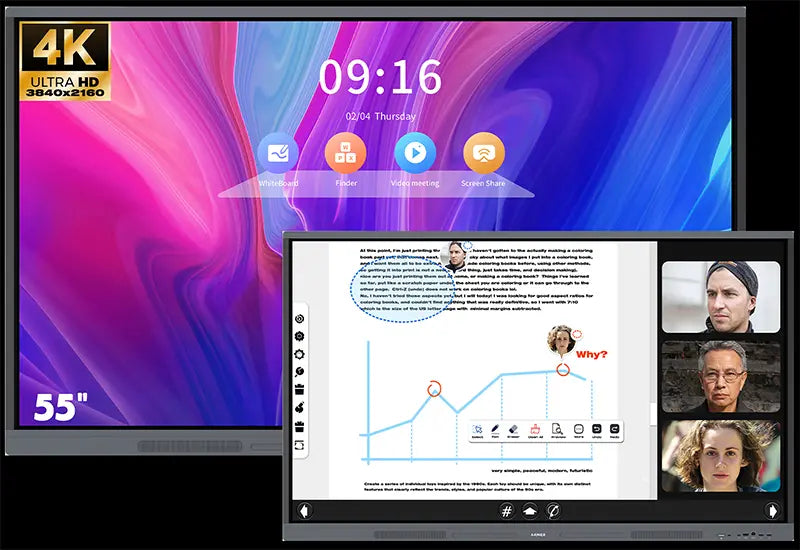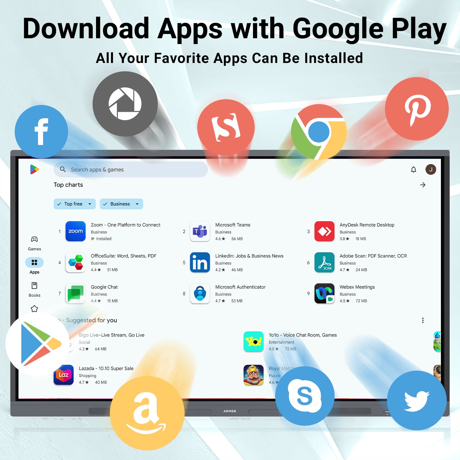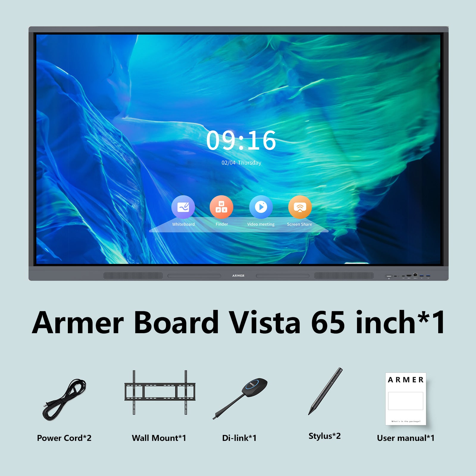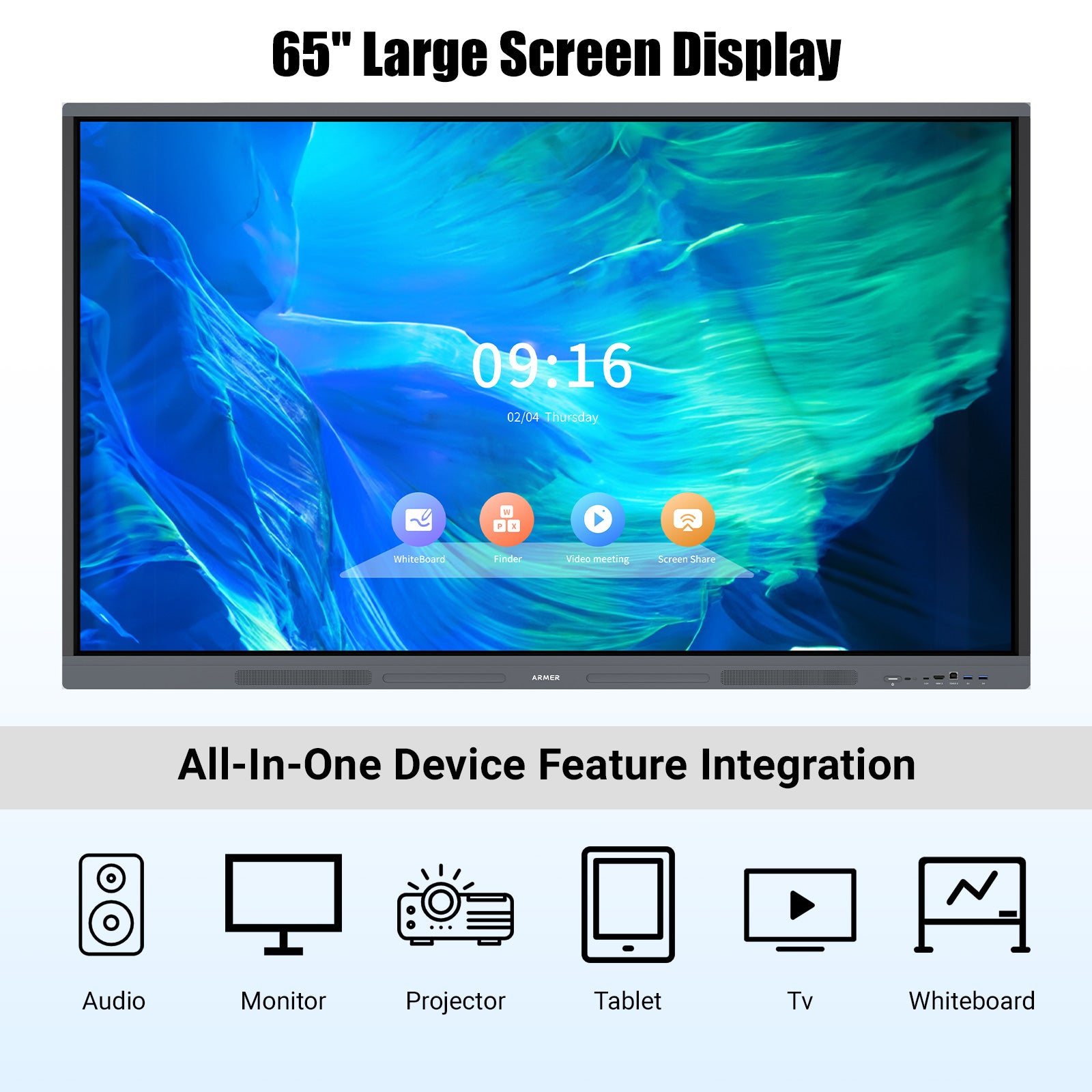 Armer Board Elite 65-inch Smart Board for Business and Meetings offers a 4K Ultra HD Large Touch Screen, with 4GB RAM + 32G SSD for Android 11.0 and 8GB RAM + 256G SSD for Windows dual system switching. It combines the functions of a large computer and TV, making it suitable for business offices, office meetings, and home entertainment. This interactive smart whiteboard serves as an excellent brainstorming and meeting tool, facilitating demonstrations and annotations. Multiple users can simultaneously share up to 9 screens, connecting from Mac/Windows/iOS/Android devices for real-time editing and sharing. With 20-point multi-touch capability, creativity can be unleashed by scanning the QR code. Armer's open ecosystem allows you to download any apps you need. Additionally, the canvas whiteboard content created on the LCD screen supports export to cloud drives like Google Drive, OneDrive, etc.